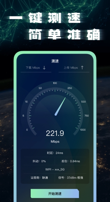 一款方便快捷的测速软件,支持WiFi,4G,5G等网络测速,一键测试实时网络速度,网络问题诊断